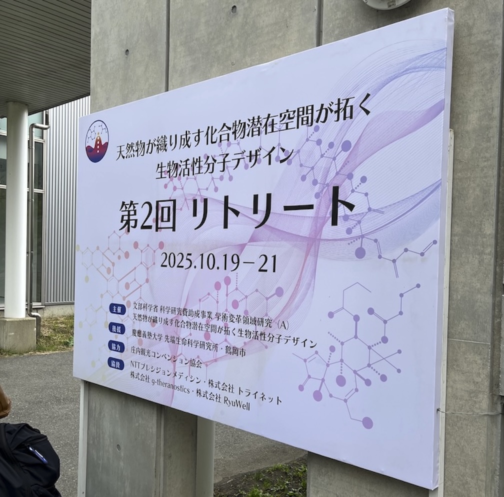 若手の会、リトリートと当研究室の学生も発表しました。ここが学会デビューになった学生もいます。有機化学以外の背景を持つ研究者に対しての説明は容易ではないと思いますが、この領域にいる人達は異分野を理解しようとする指向が強く、大変有意義な議論ができたと思っています。前回のリトリートでも感じましたが、今回のような合宿形式の企画は年に1回くらいはやるべきだなと思います。一緒に参加した学生たちもまた参加したいと思っているようですが、今度は新しいメンバーにもこの世界を味わってもらえたらいいなと思います。次回のリトリートは2026年12月に予定されています。