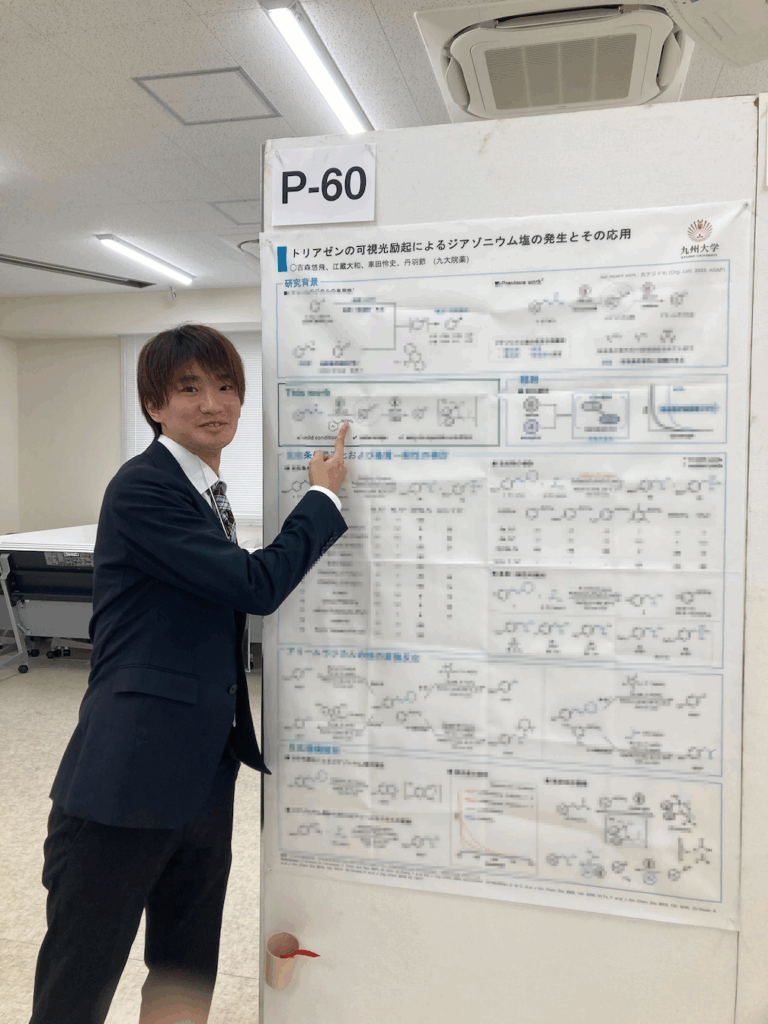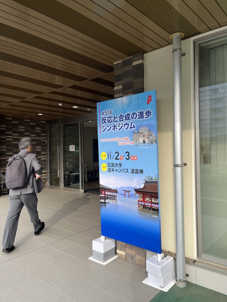 11月に広島大学霞キャンパスで開催された第51回反応と合成の進歩シンポジウムに参加し、江蔵と吉森の両名がそれぞれ口頭発表・ポスター発表を行いました。九大の研究室からは初めての参加・発表ですが、丹羽は理研の研究員のときに数回参加した経験があります。日本薬学会の化学系では最もレベルが高いと思っていますが、やはり今回も面白い発表が盛り沢山でした。いつものように全合成がまず目立ちますが、設計された分子を用いた生物学的実験や長波長の光を用いた化学反応など、一定のトレンドを感じられました。次回の進歩シンポは2026年10月24-25日に星薬科大学で開催されるとのことです。
